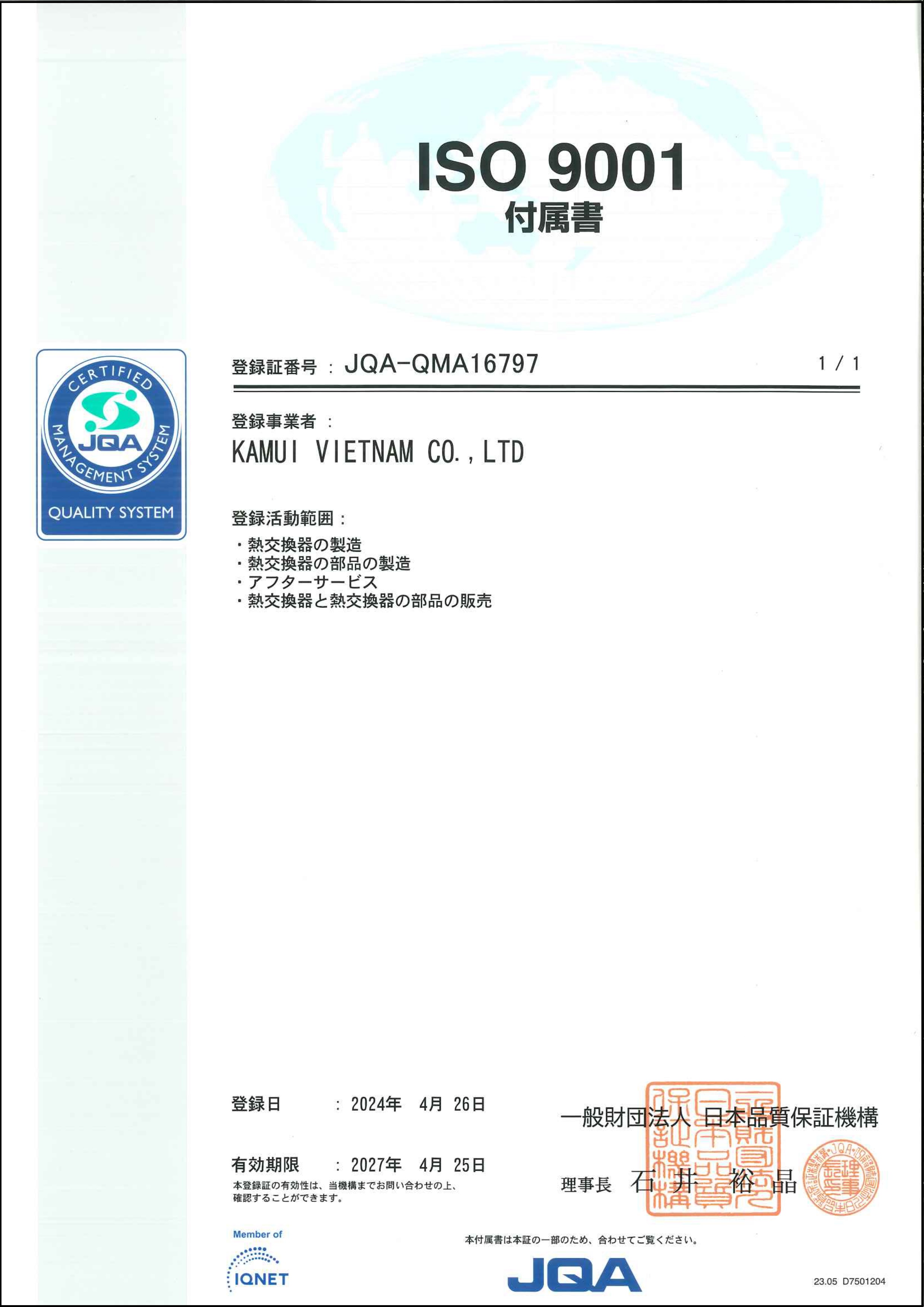 - Work hard to bring highest quality products to customers. - Control strictly the local manufacturing process and cooporate with Kamui Sangyo Japan in inspection process to assure Japan quality for our products. - Contribute to society, customers and make better working environment, better quality of life for our employees