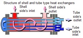 Fluid is passed through the shell (cylinder) and various tubes (heat transmission tubes), and heat exchanged between them.